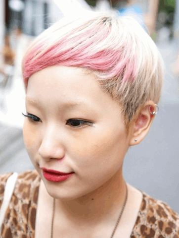 Diese trendige rosa und blonde pixie cut schafft einen gut definierten Rahmen um das Gesicht, und lässt keinen Raum für das Gefühl selbst bewusst. Mit einem Haarschnitt das Fett und die futuristisch anmutende, Pastell-rosa Schatten in die Fransen bringt eine weichere, spielerische element, um den Stil.